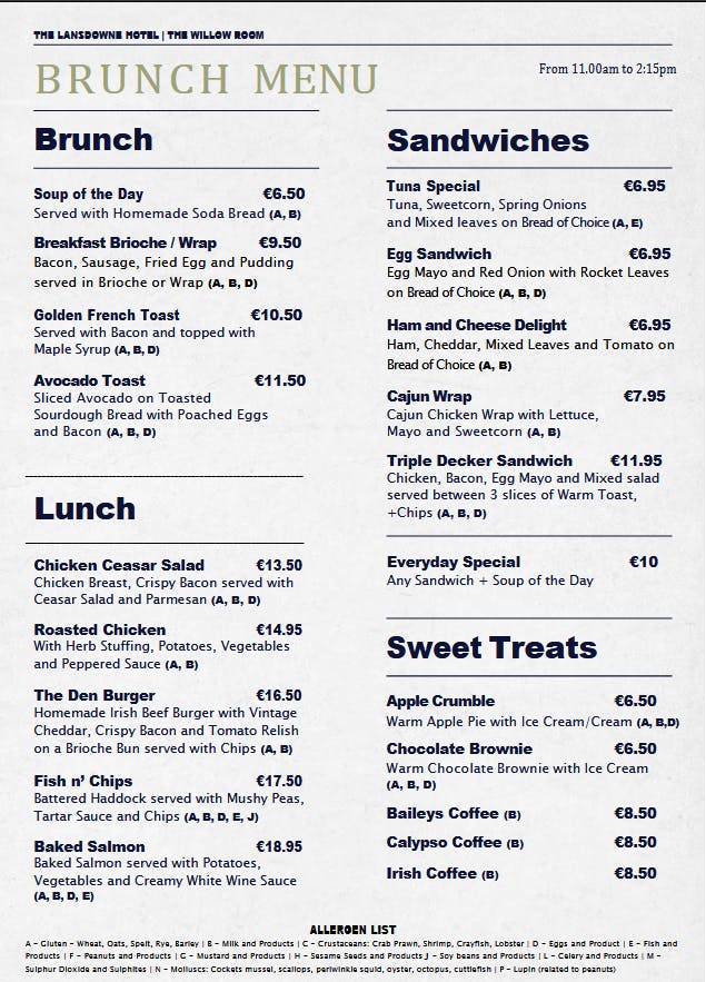 Enjoy our popular Willow Room for lunch Monday to Friday from 11:00pm to 2:15pm, or sample a selection of classic bar dishes from 4:30pm to 9:00pm, Monday to Saturday.