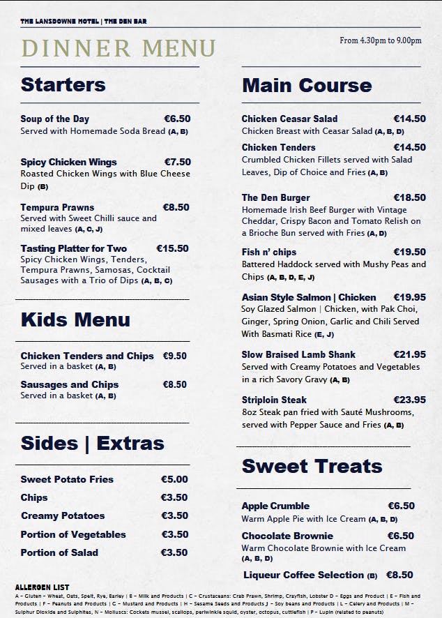 Please note: The Den Bar is closed on Sundays and Bank Holidays.